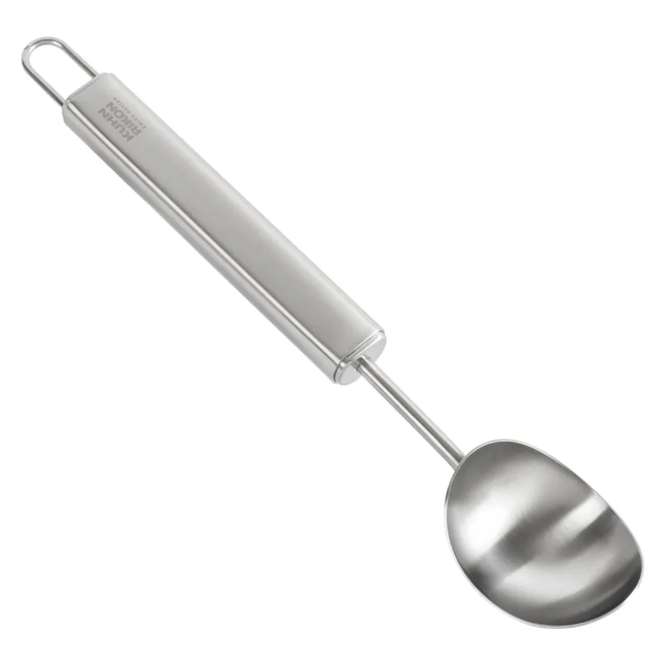 Entdecke den formschönen Eisportionierer Essential von Kuhn Rikon, der aus hochwertigem Edelstahl gefertigt ist. Die flachen Kanten und der lange Stiel ermöglichen es, mühelos die Ecken des Eisbechers zu erreichen. Vielseitigkeit zeichnet diesen Küchenhelfer aus, denn er eignet sich nicht nur für Eiskugeln, sondern auch für Obst, Melonen, Fleischbällchen oder Reis. Dank der präzisen Verarbeitung ist er spülmaschinengeeignet, wobei das Abwaschen von Hand empfohlen wird. Nach Gebrauch kannst du den Portionierer bequem an der praktischen Öse aufhängen, sodass er immer griffbereit ist. Dieser Küchenhelfer überzeugt durch sein durchdachtes Design.