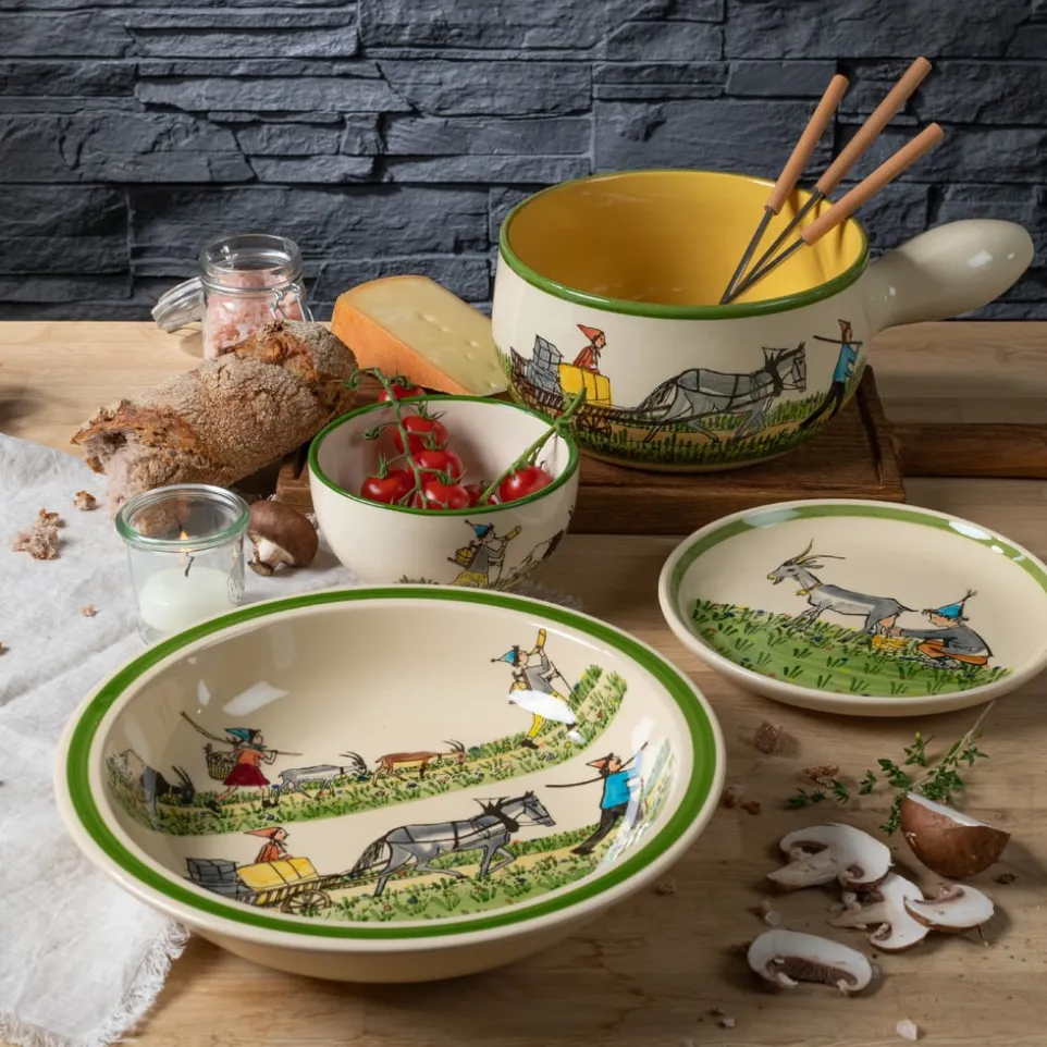 Tauche ein in die alpine Welt mit dem Fondue Caquelon Alpaufzug von Kuhn Rikon. Hergestellt aus hochwertiger Keramik, verspricht dieser Fondue-Topf eine gleichmässige Wärmeverteilung und optimale Kochergebnisse. Er ist vielseitig einsetzbar und eignet sich für verschiedene Kochfelder wie Elektro-Edelstahl, Elektro-Glaskeramik, Gas und Halogen. Ob für gesellige Abende mit Freunden oder für gemütliche Familienessen, dieses Caquelon schafft eine einladende Atmosphäre. Die robuste Verarbeitung garantiert Langlebigkeit und macht es zu einem unverzichtbaren Begleiter in deiner Küche. Entdecke die Kunst des Fonduekochens mit Kuhn Rikon.