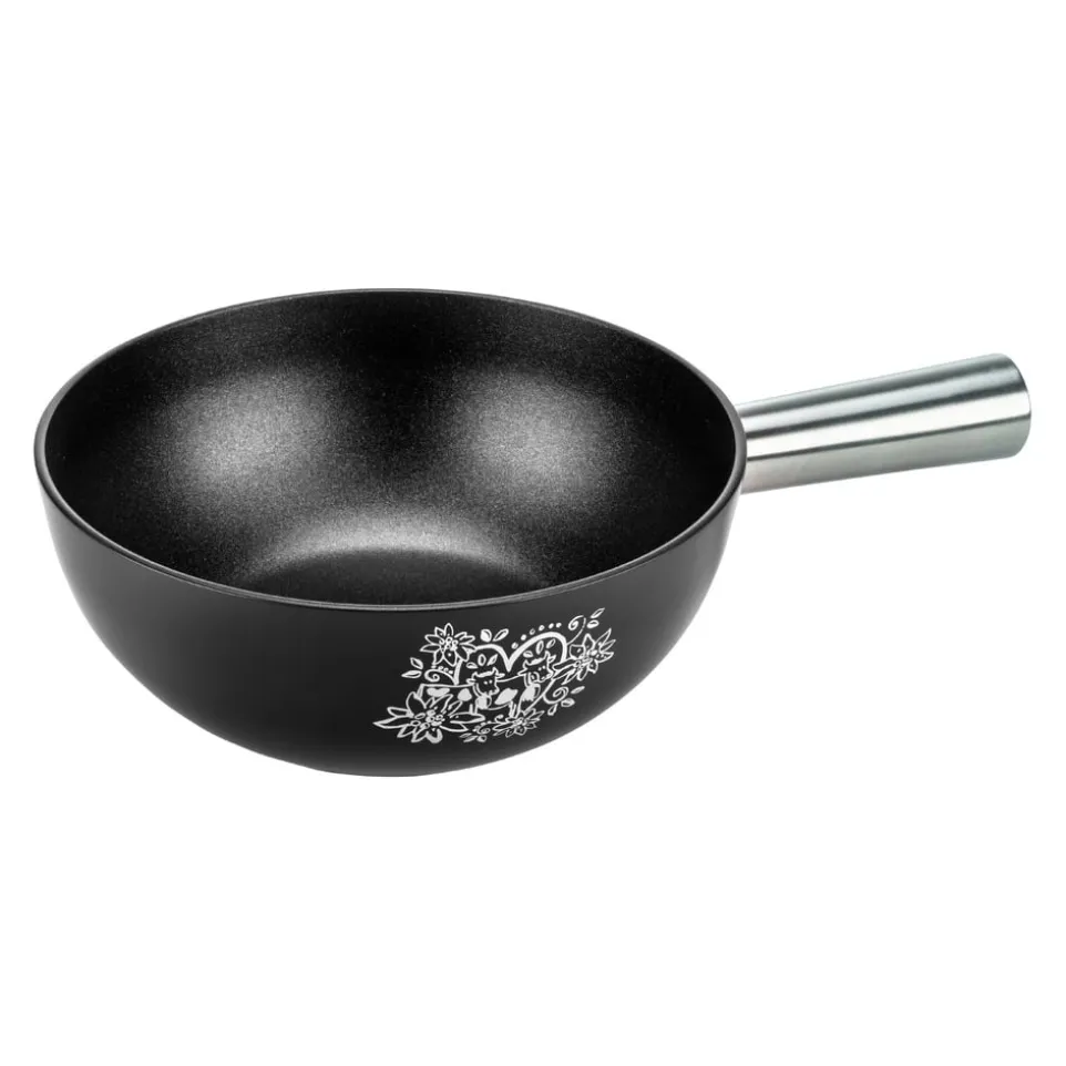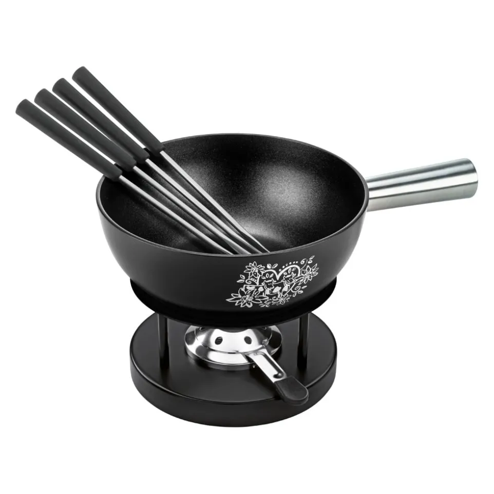 Gourmets aufgepasst: Dieses Fondue-Set der Qualitätsmarke Kuhn Rikon besteht aus einem Caquelon mit Edelstahlgriff, 4 Gabeln mit Kunststoffgriff, Rechaud und Pastenbrenner. Die induktionstaugliche Fonduepfanne ist aus leichtem Aluminium mit Antihaftbeschichtung und eignet sich für alle Herdarten. Sie verfügt über eine erstklassige Wärmeleitfähigkeit und lässt sich auch als Wok oder Stielkasserolle einsetzen. Ausserdem ist sie mit Schwamm und Spülmittel leicht zu reinigen.