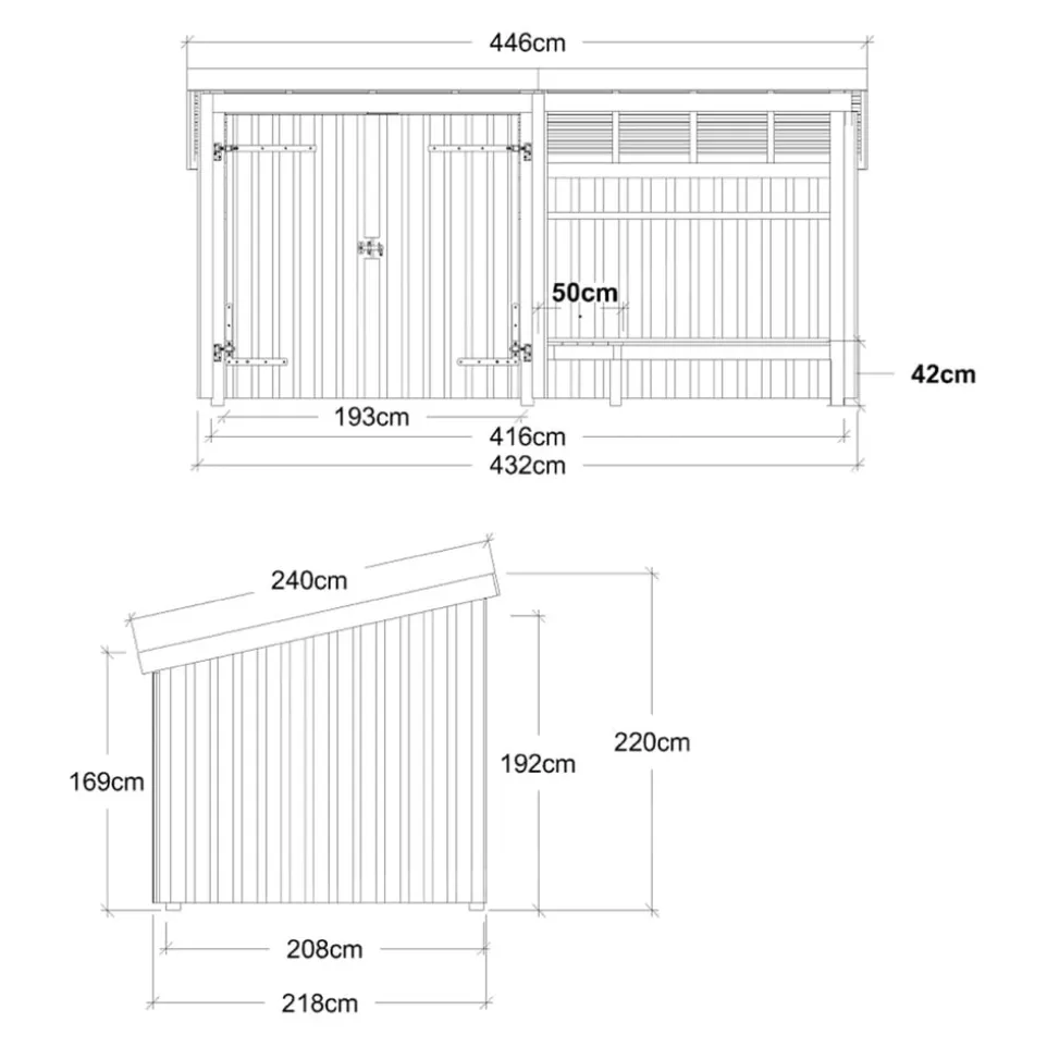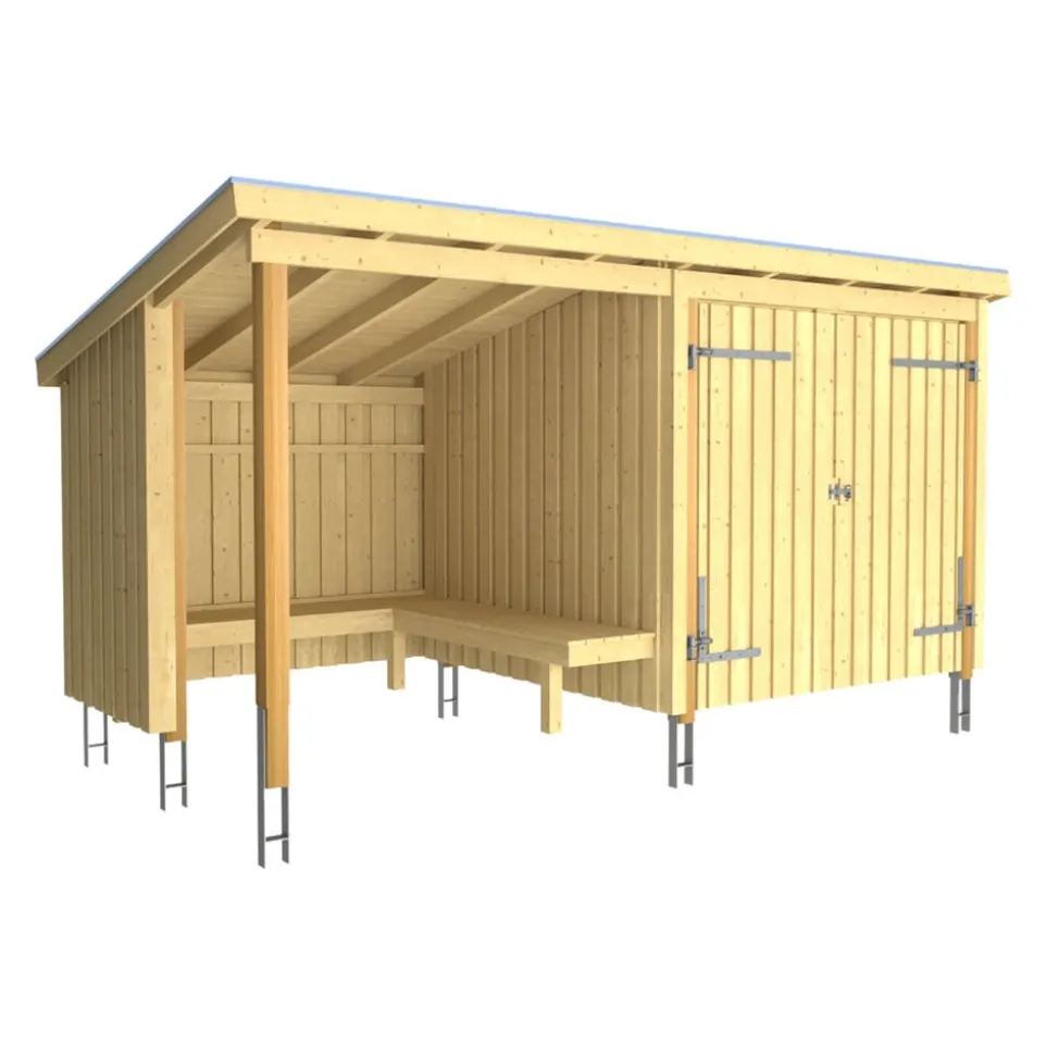 Ausstattung | inkl. Beschläge/Schrauben, Bank, Dachpappe, Aluleisten und H-Pfostenfüße |