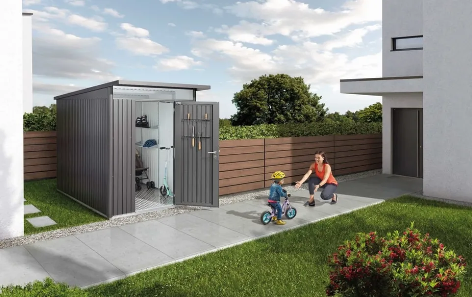 Chaos im Garten? Nicht mit diesem Geräteschrank. Hinter der robusten Fassade aus Stahlblech finden Gartenwerkzeug, Grill und andere Outdoor-Utensilien einen sicheren und trockenen Platz. Der regenfeste Schrank ist mit einem abschliessbaren Drehgriff-Zylinderschloss ausgestattet. Inkl. Reserveschlüssel. In verschiedenen Grössen und Farben erhältlich.Bitte beachte: Bei einer Geräteschrank-Bestellung inklusive Montage ist ein Bodenrahmen zwingend. Er verleiht dem Geräteschrank auch ohne Betonfundament die notwendige Stabilität. Die mitgelieferten Bodenanker tragen zur Sturmsicherheit bei. Vier Kunststoff-Eckverbindungen ermöglichen die exakte Montage. Der Alu-Bodenrahmen hat einen Querschnitt von 40 x 40 mm. Du findest den passenden Bodenrahmen in unserem Shop unter der Artikelnummer: 1200442.Die Bodenplatte wird bei der Montage empfohlen. Hochwertiger Alu-Riffelblechboden, elegant und funktionell. Zur optimalen Verlegung der Alu-Bodenplatten ist der Alu-Bodenrahmen erforderlich. Beachte bitte, dass die Alu-Bodenplatte mit einer Schüttung oder XPS-Hartschaumplatten in einer Stärke von ca. 2-3 cm zu unterfüttern ist (nicht im Lieferumfang enthalten). Du findest die passende Bodenplatte in unserem Shop unter der Artikelnummer: 1202064.Unser Montageservice braucht im Idealfall einen ebenen Untergrund (Betonfundament) für die Platzierung der Biohort Produkte, hierfür braucht es eventuell eine Baubewilligung. Ob du eine Baubewilligung benötigst, erfährst du beim Bauamt der Gemeinde, wo sich das Grundstück befindet. Bitte erkundige dich frühzeitig.Bitte beachten Sie, dass bei einer Heimlieferung ohne Montageservice die Lieferung lediglich bis zur Bordsteinkante erfolgt.