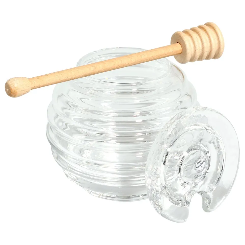 Mundgeblasen und Swiss made aus Hergiswil versüsst dieser Honigtopf jeden Morgen. Und der praktische Honigdreher aus Holz gehört auch dazu.