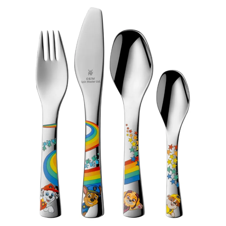 Ein tolles Geschenk für Kinder ab 3 Jahren: Mit diesem Kinderbesteck-Set lernen die Kleinen mit Messer, Gabel und Löffel umzugehen – wie grosse Heldinnen und Helden. Das 4-teilige Set besteht aus 1 Messer, 1 Gabel und 2 Löffel. Sie sind extra gemacht für kleine Hände; griffig und leicht. Das Messer verfügt über einen kindgerechten Wellenschliff, die Gabel hat stumpfe Zinken, der Löffel abgerundete Kanten. Das Besteck ist aus rostfreiem Edelstahl, hygienisch, spülmaschinenfest und praktisch unverwüstlich. Mit am Tisch sitzen die heldenhaften Hunde aus dem Kinderfilm «Paw Patrol»; sie zieren die Griffe des Bestecks und bringen die Kinderaugen bestimmt zum Leuchten!