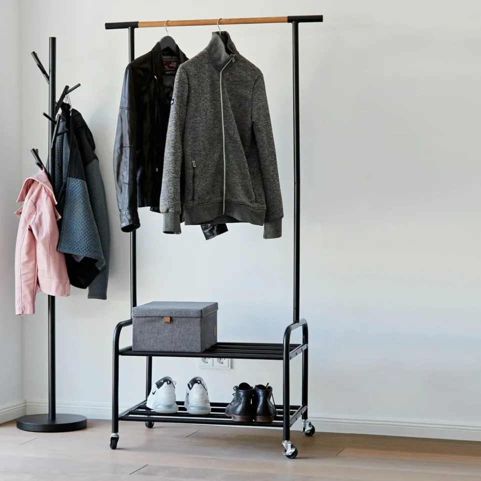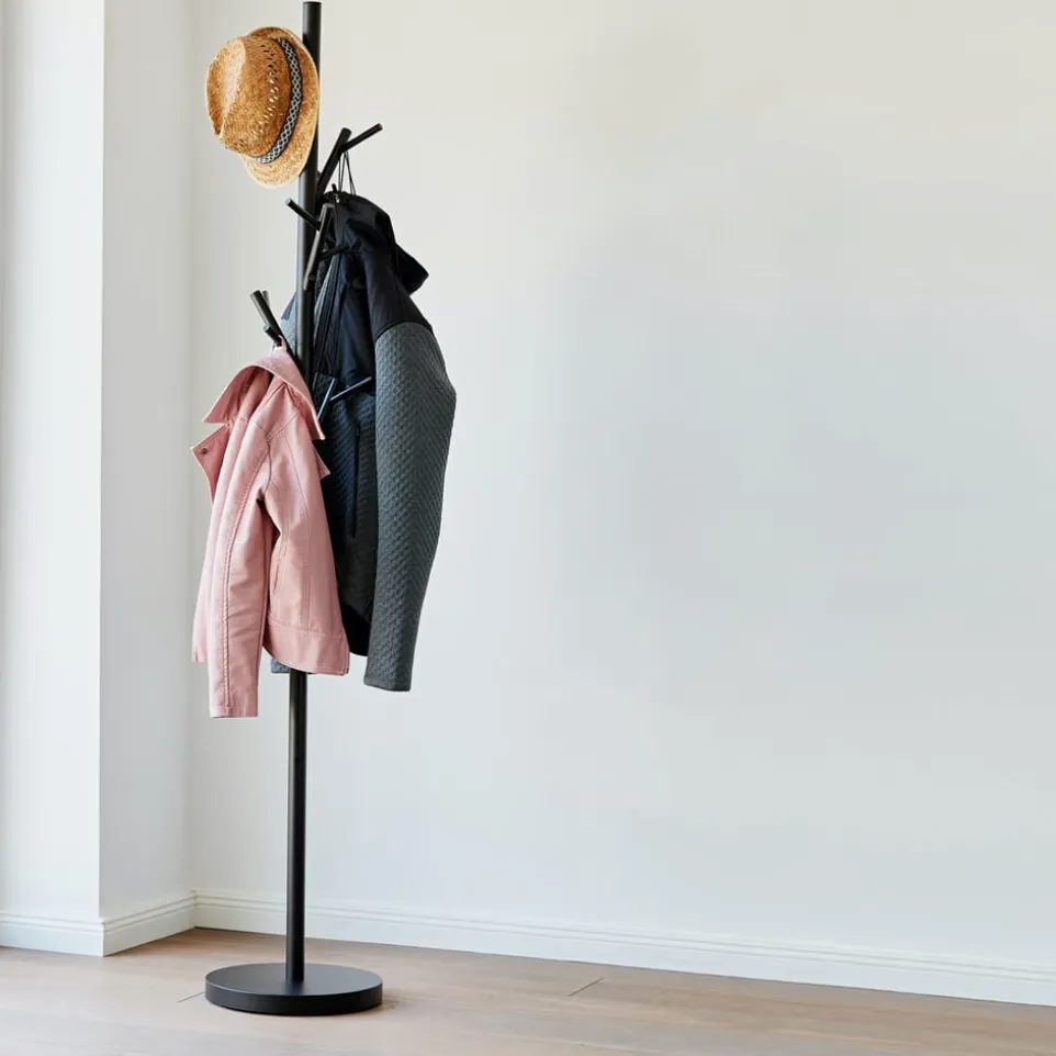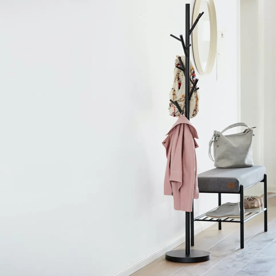 Kleiderständer STORE hält Ordnung mit Stil. Besonders für enge Eingangsbereiche oder kleine Räume ist der kunstvolle Garderobenständer eine gute Lösung. Schliesslich lässt er sich einfach aus dem Weg räumen, wenn es eng wird.