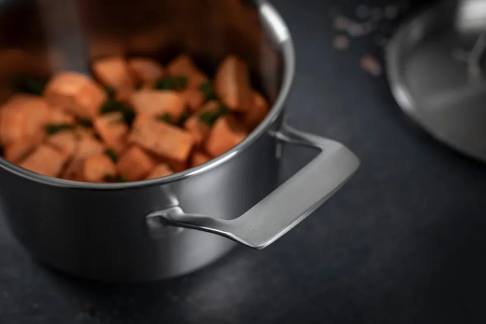 Ergonomische Griffe aus Edelstahl bleiben auch bei hohen Temperaturen angenehm kühl. Der CULINARY FIVEPLY Kochtopf von Kuhn Rikon bietet dank seines 5-ply Mehrschichtmaterials eine gleichmässige Wärmeverteilung, die bis zum Rand reicht. Egal, ob Risotto, Curries oder Beilagen – alle Gerichte gelingen perfekt. Der geschlossene Rand erleichtert das Ausgiessen, während die Literskalierung das Abmessen direkt im Topf ermöglicht. Spülmaschinengeeignet, jedoch wird Handwäsche empfohlen. Dank der robusten Bauweise und der hochwertigen Materialien ist der Kochtopf langlebig und für alle Herdarten, inklusive Induktion, geeignet. Er ist backofentauglich bis 240°C.