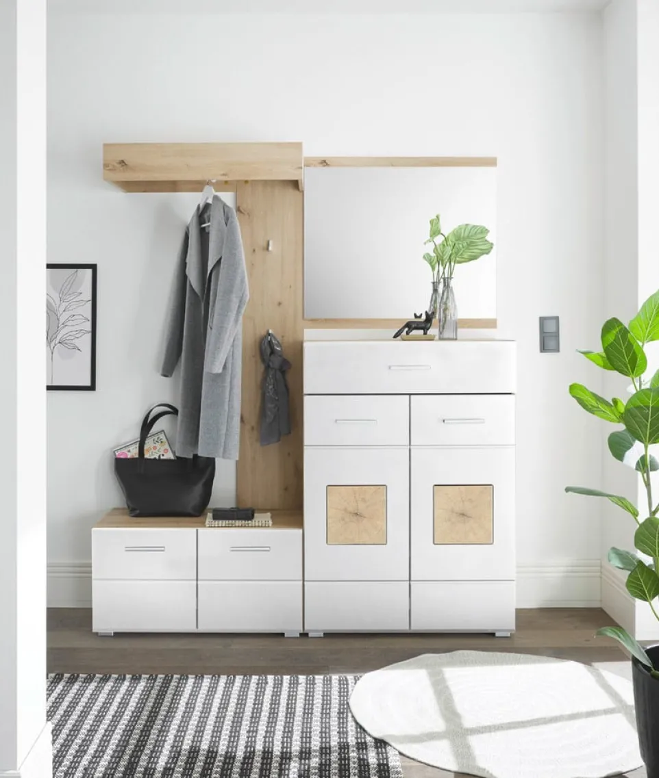 Set, bestehend aus | Garderobenbank, Garderobenpaneel, Schuhschrank, Spiegel |
