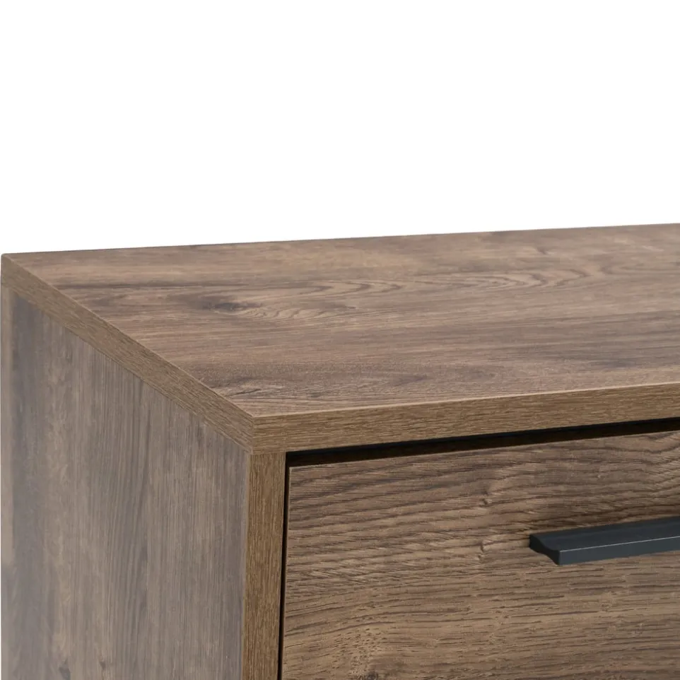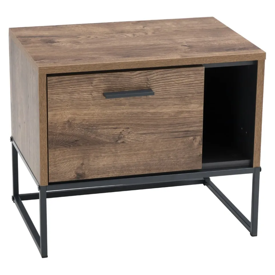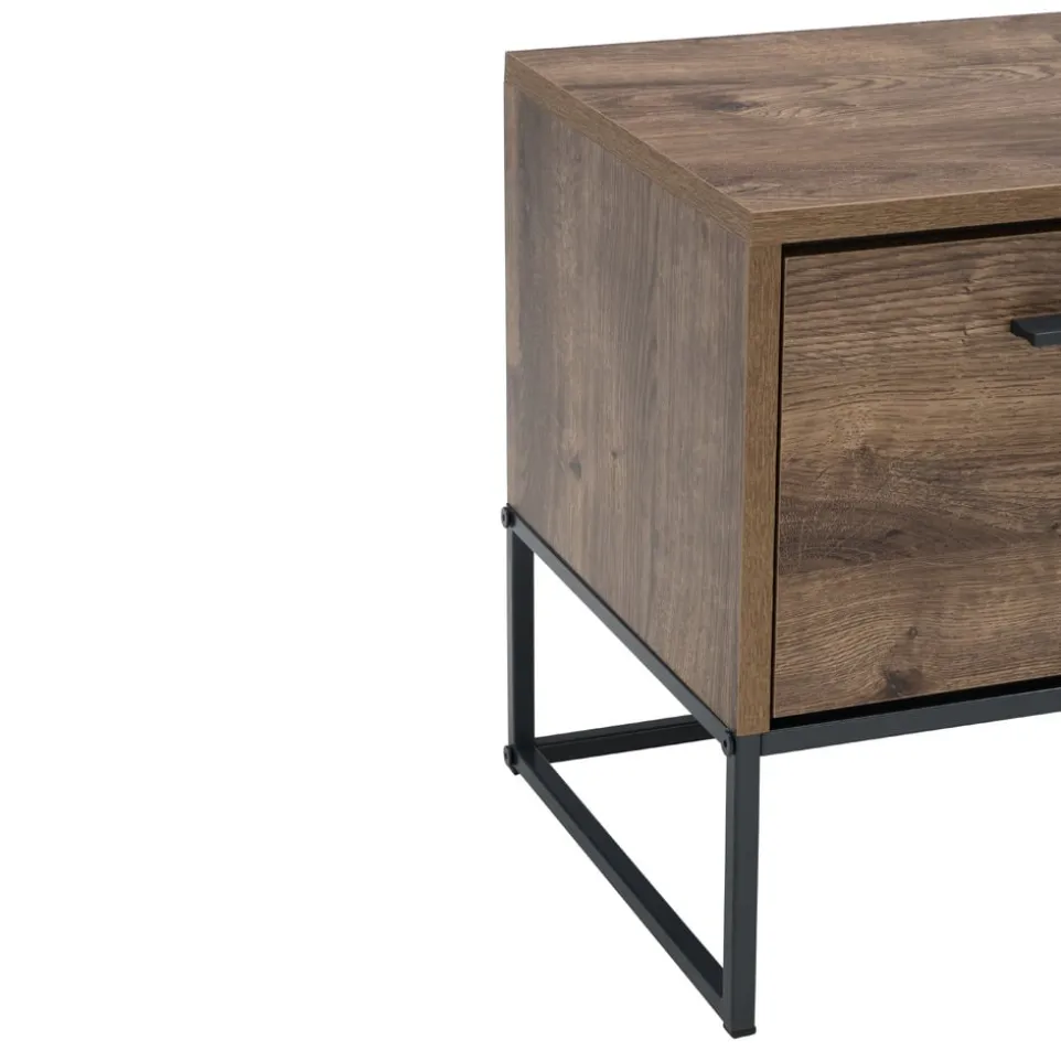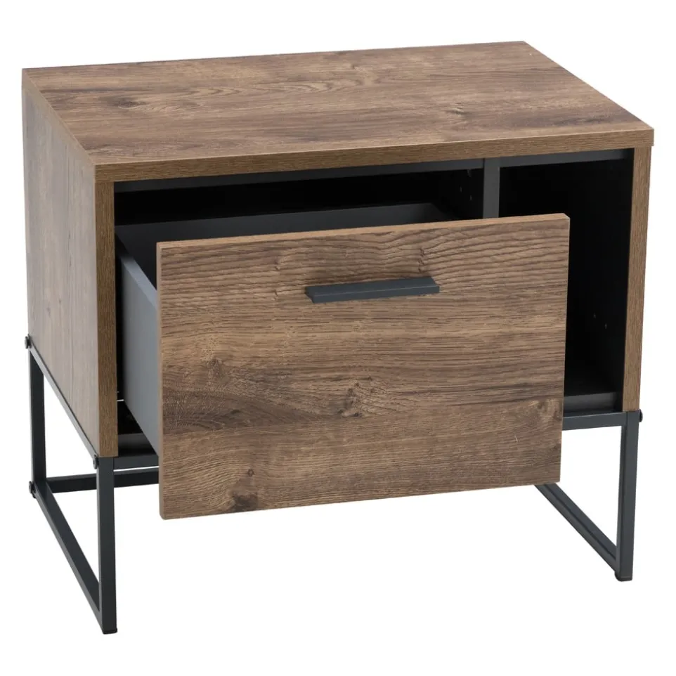 Ein rustikaler Hingucker mit modernen Stilelementen ist der Nachttisch JURA. Die Kombination aus Eichenoptik und schwarzen Metallfüssen setzt einen besonderen Akzent in Ihrem Schlafzimmer. Mit einer Schublade ausgestattet, erhalten Sie noch ein wenig Stauraum. Es handelt sich um die perfekte Ergänzung für weitere Möbelstücke aus unserer JURA Möbel-Serie.