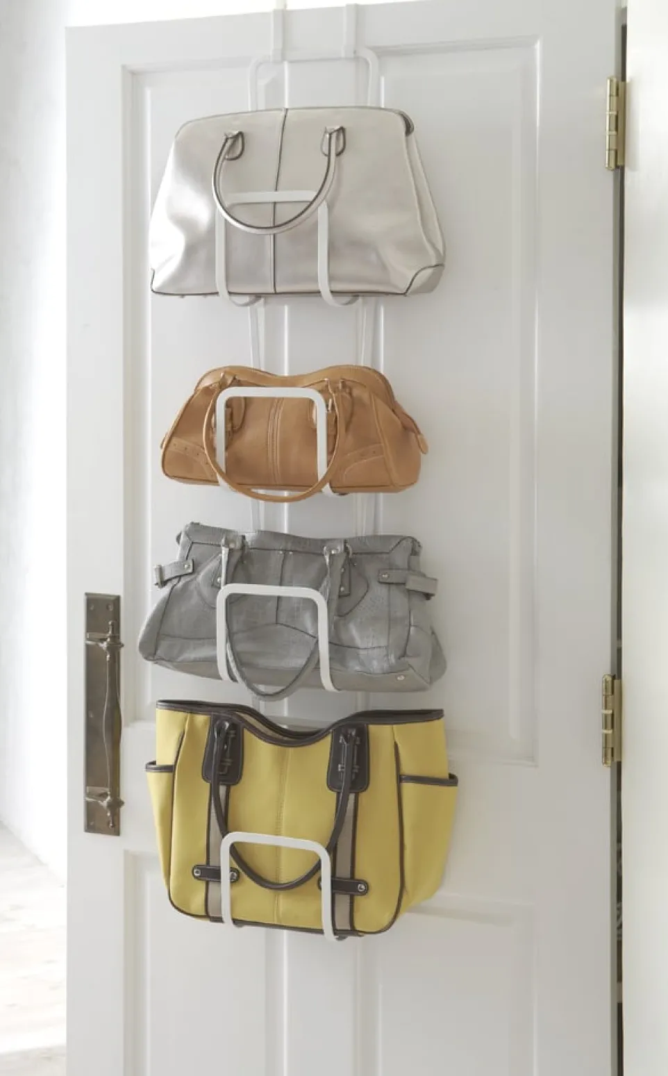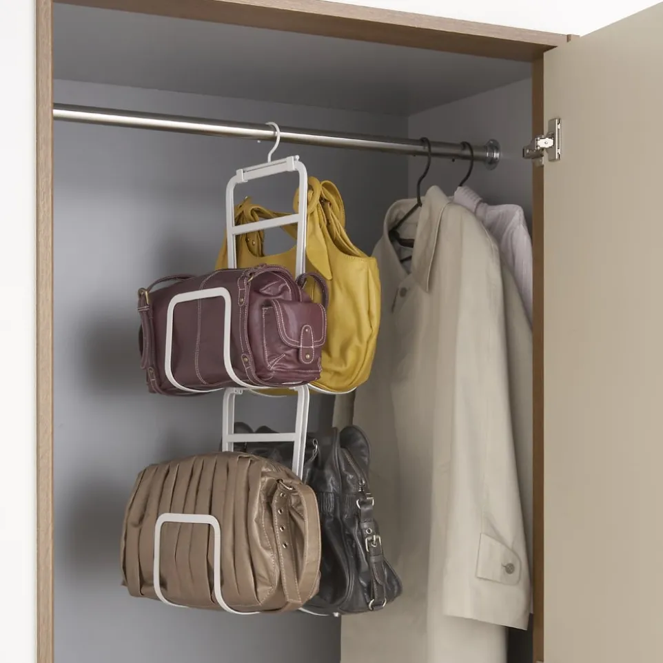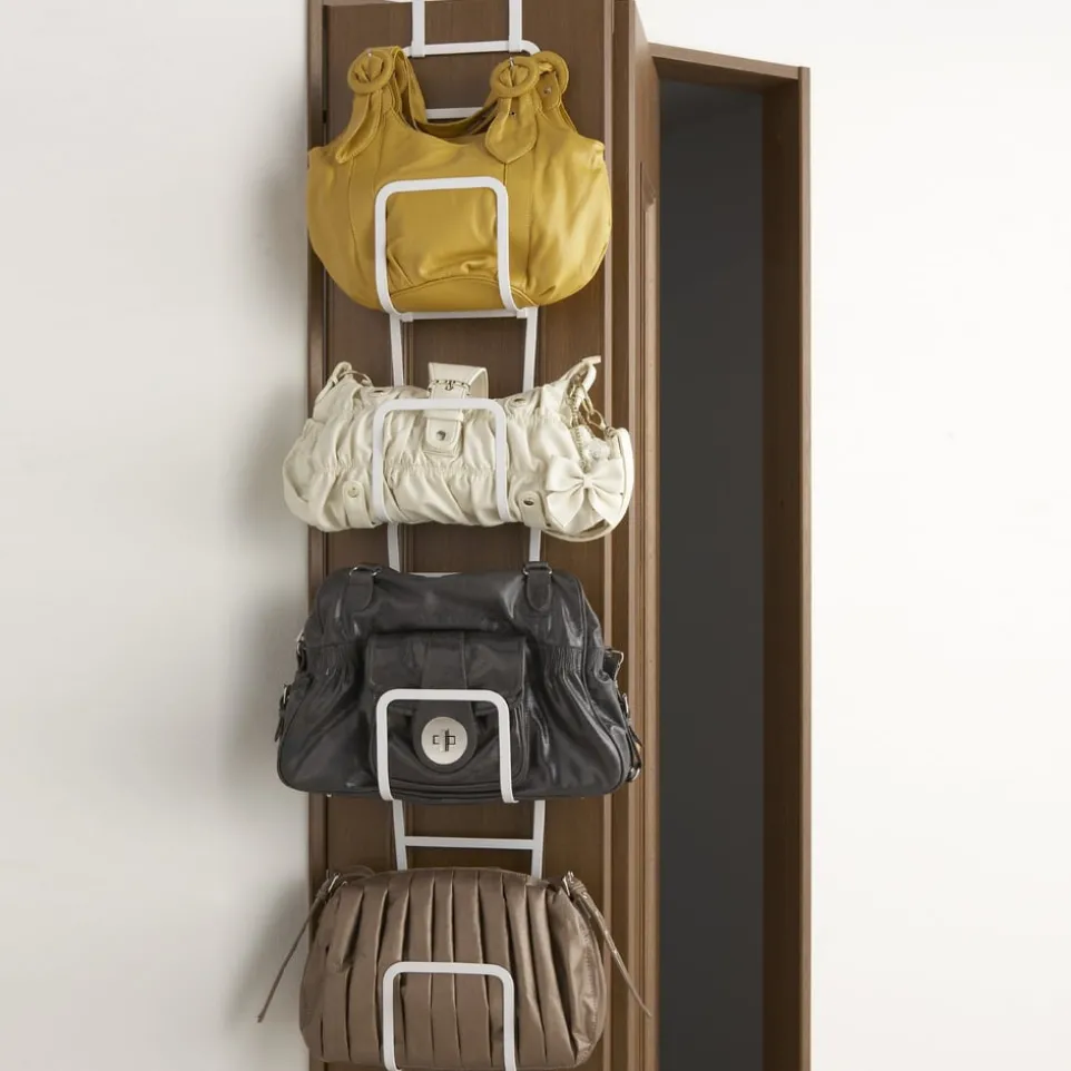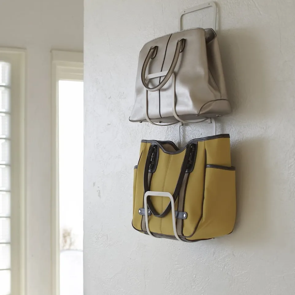 Schlicht, clever und praktisch: Der Taschenhalter zum Einhängen aus der Accessoires-Serie YAMAZAKI bringt Ordnung in Ihre Hut- und Taschensammlung. 4 Haken bieten die Möglichkeit, Ihre Lieblingstaschen zwischenzulagern und mit einem Griff zur Hand zu haben, bevor es nach draussen geht.