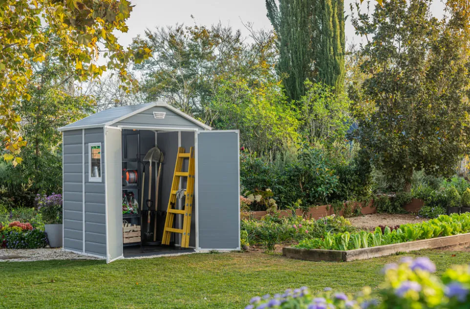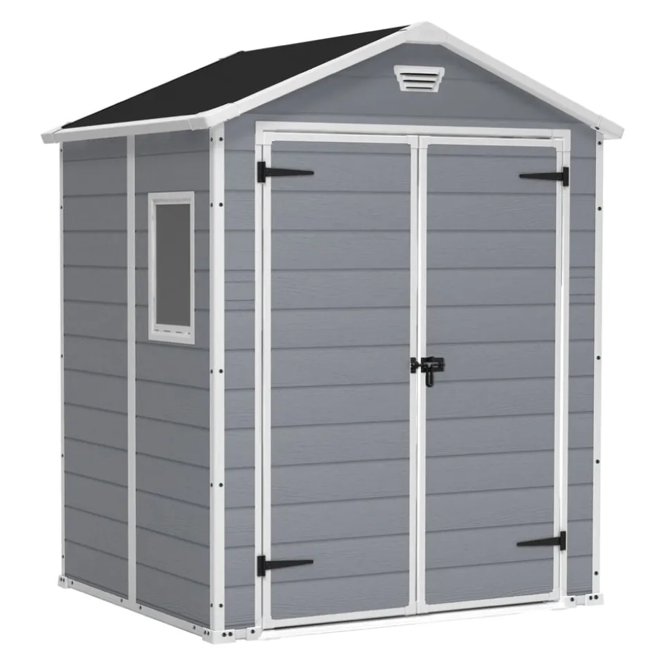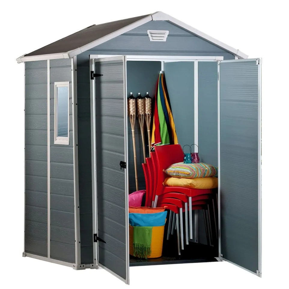 Der extraschmale Geräteschrank MANOR schafft Raum, ohne selbst viel zu benötigen. Das Gartenhäuschen besteht aus wetterfesten Kunststoffwänden und einer Bodenplatte. So bleiben die Gartenutensilien trocken und sauber. Die Decke ist hoch genug, um sich bequem bewegen zu können, dazu gibt es ein Fenster für natürliches Licht. Die Türe lässt sich mit einem Vorhängeschloss (nicht inklusive) verriegeln. In verschiedenen Grössen erhältlich.