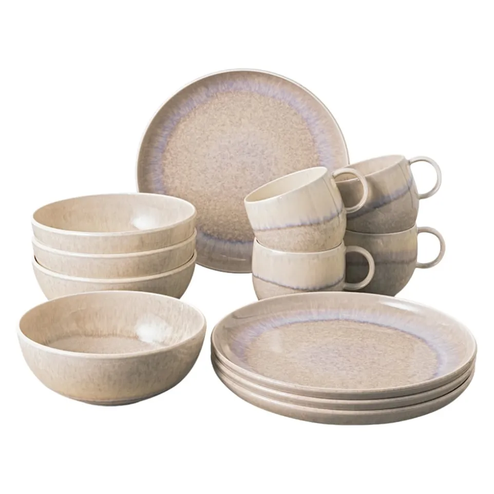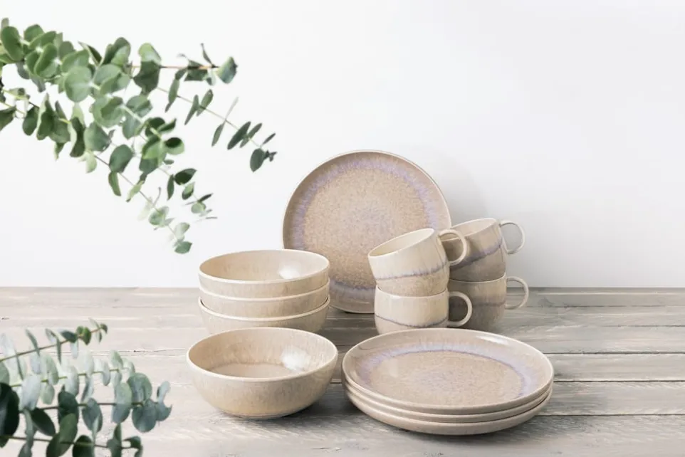Die Effektglasur der Geschirrset-Kollektion Perlemor Sand von Villeroy & Boch verleiht jedem Stück einen einzigartigen Charakter. Dank der speziellen Laufglasur entstehen faszinierende Muster, die durch das Zusammenspiel von metallischen und mineralischen Partikeln geprägt sind. Bei jedem Brennvorgang reagiert die Glasur unvorhersehbar, sodass kein Stück dem anderen gleicht. Praktisch ist, dass das Porzellan spülmaschinenfest, gefrierfachgeeignet und mikrowellenfest ist. Diese Eigenschaften machen das Geschirrset nicht nur ästhetisch ansprechend, sondern auch im Alltag vielseitig einsetzbar. Ein Geschirrset für alle, die das Besondere schätzen.