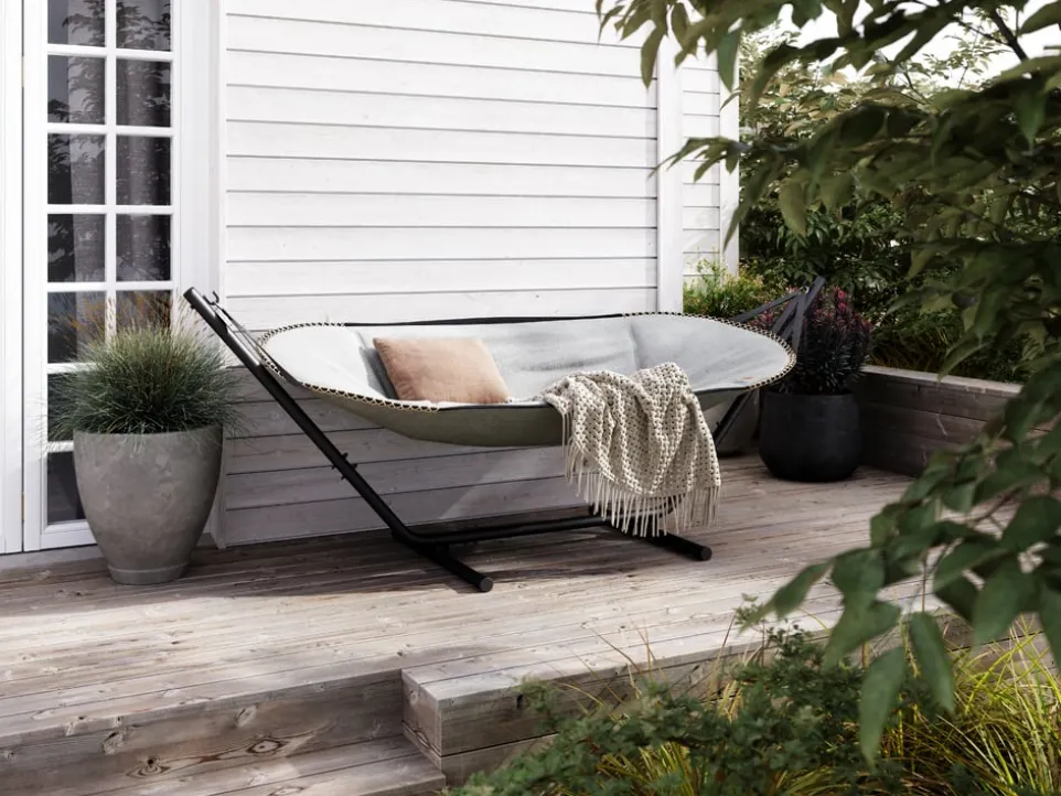 Geniesse in der Hängematte COBANA entspannte Stunden und lass die Seele baumeln – dort, wo du willst. Dank des Gestells aus stabilem Aluminium kann die Hängematte einfach umgestellt werden. Bei schlechtem Wetter lässt du das robuste Gestell problemlos draussen stehen. Die Hängematte selbst besteht aus einer strapazierfähigen Olefin-Fasermischung, die nach ÖKO-TEX®-Standard 100 zertifiziert ist. Der Stoff ist scheuerfest, lichtecht sowie wasserabweisend. Die maximale Belastbarkeit liegt bei 150kg. Mit der Hängematte COBANA schaffst du deine persönliche Ruheoase im Garten oder auf der Terrasse – für deine persönlichen Relax-Momente. In verschiedenen Farben erhältlich.