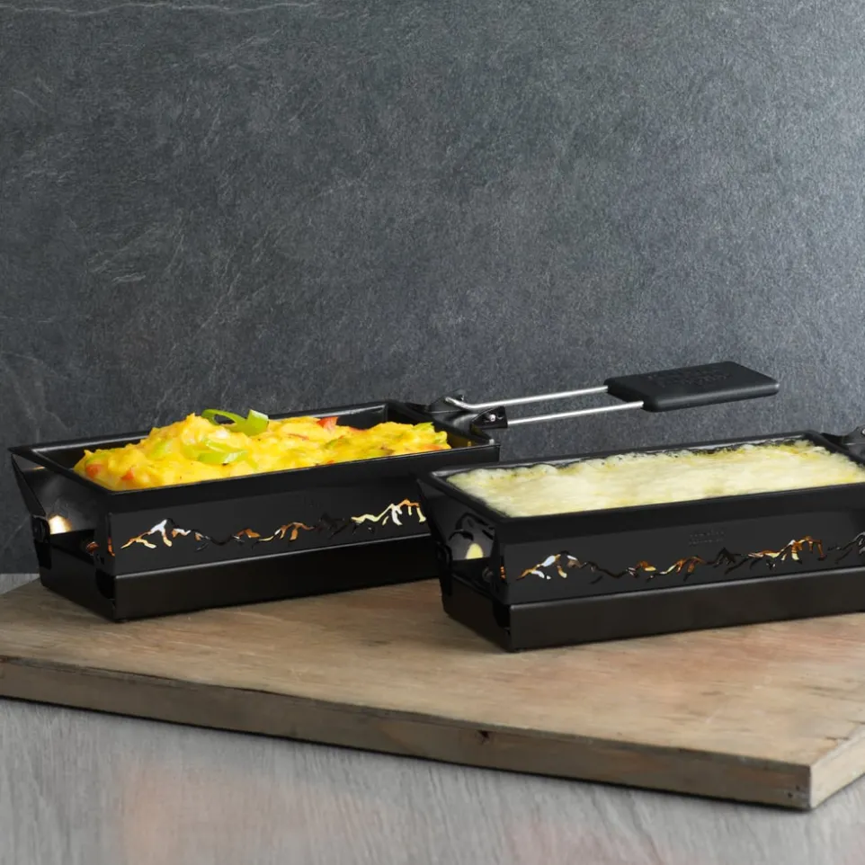 Grossen Genuss verspricht das Mini-Raclette-Set FIESCH: Lieblingskäse aufs Pfännchen, Kerzen unter das Rechaud und Geniessen. Das ausgestanzte Bergmotiv kommt bei lodernder Flamme besonders schön zur Geltung. Zu viel des Käses? Fürs kleine Rührei oder ein paar Mini-Würstchen tut FIESCH auch beim Brunch gute Dienste. Nicht spülmaschinentauglich. Die Pfanne ist antihaftbeschichtet. Marke: Kuhn Rikon.