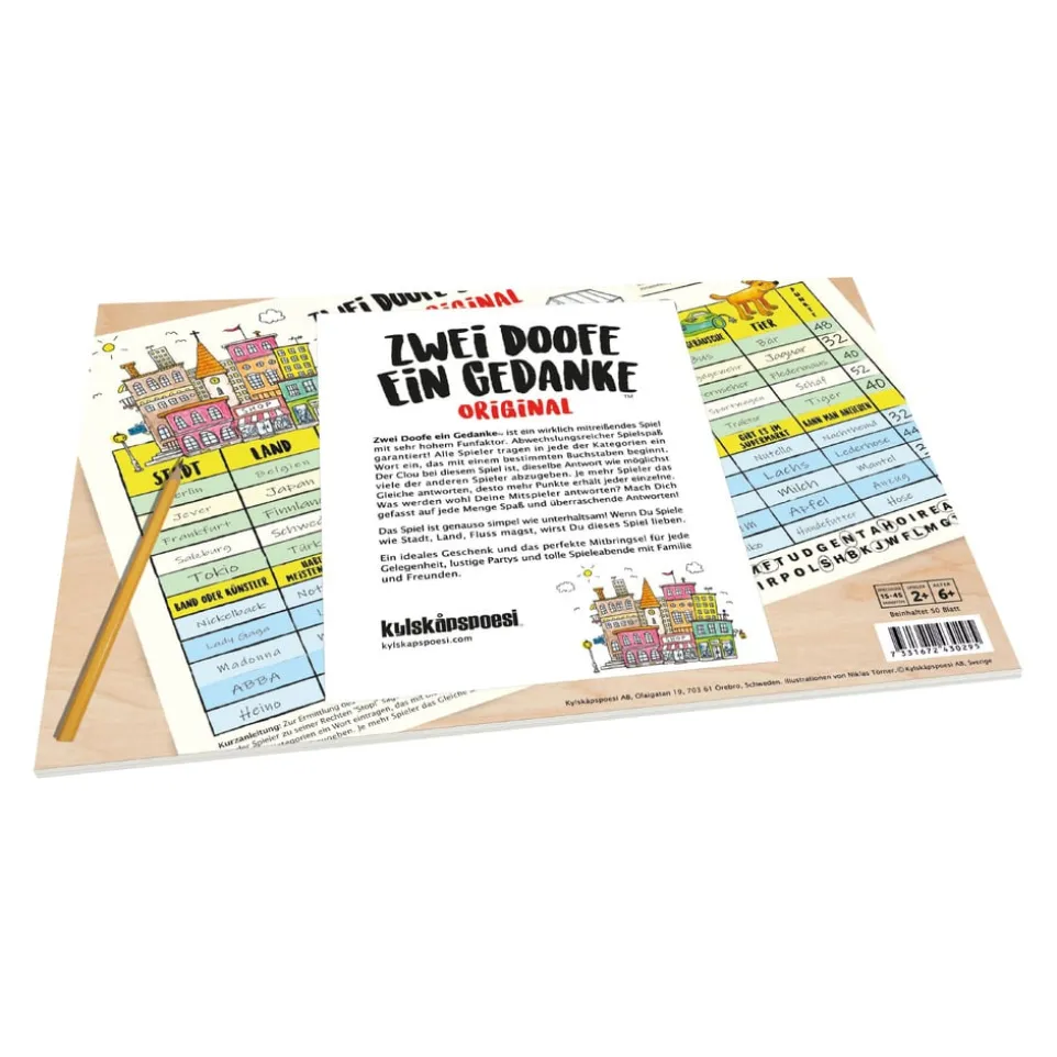 Zwei Doofe ein Gedanke bietet abwechslungsreichen Spielspass, der garantiert für viele Lacher sorgt. Dieses mitreissende Spiel von Kylskapspoesie fordert dich heraus, in verschiedenen Kategorien ein Wort mit einem bestimmten Buchstaben einzutragen. Dabei gilt es, die gleiche Antwort wie möglichst viele andere Spieler zu finden, um Punkte zu sammeln. Die überraschenden Antworten deiner Mitspieler machen das Spiel zu einem unterhaltsamen Erlebnis. Besonders Fans von Stadt, Land, Fluss werden dieses Spiel lieben. Zwei Doofe ein Gedanke ist das ideale Geschenk für jede Gelegenheit und bereichert jeden Spieleabend mit Familie und Freunden.