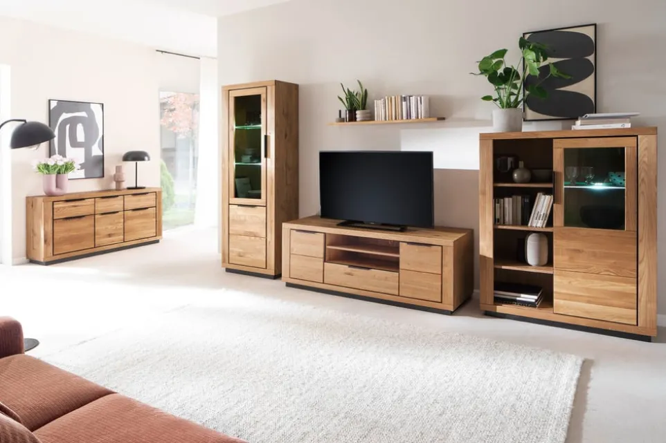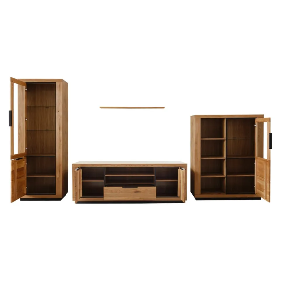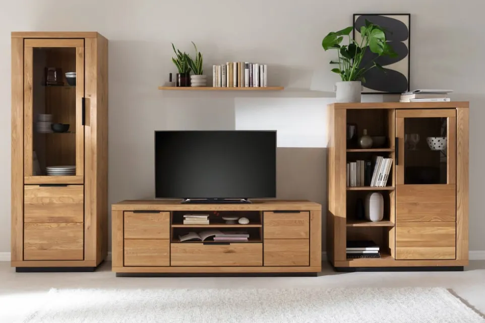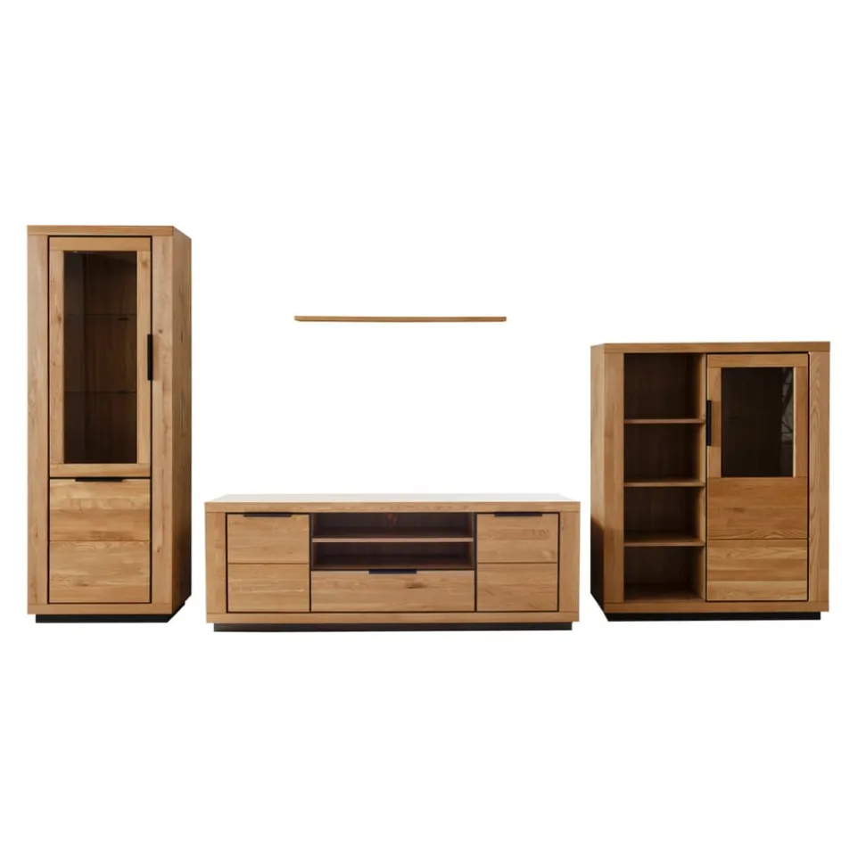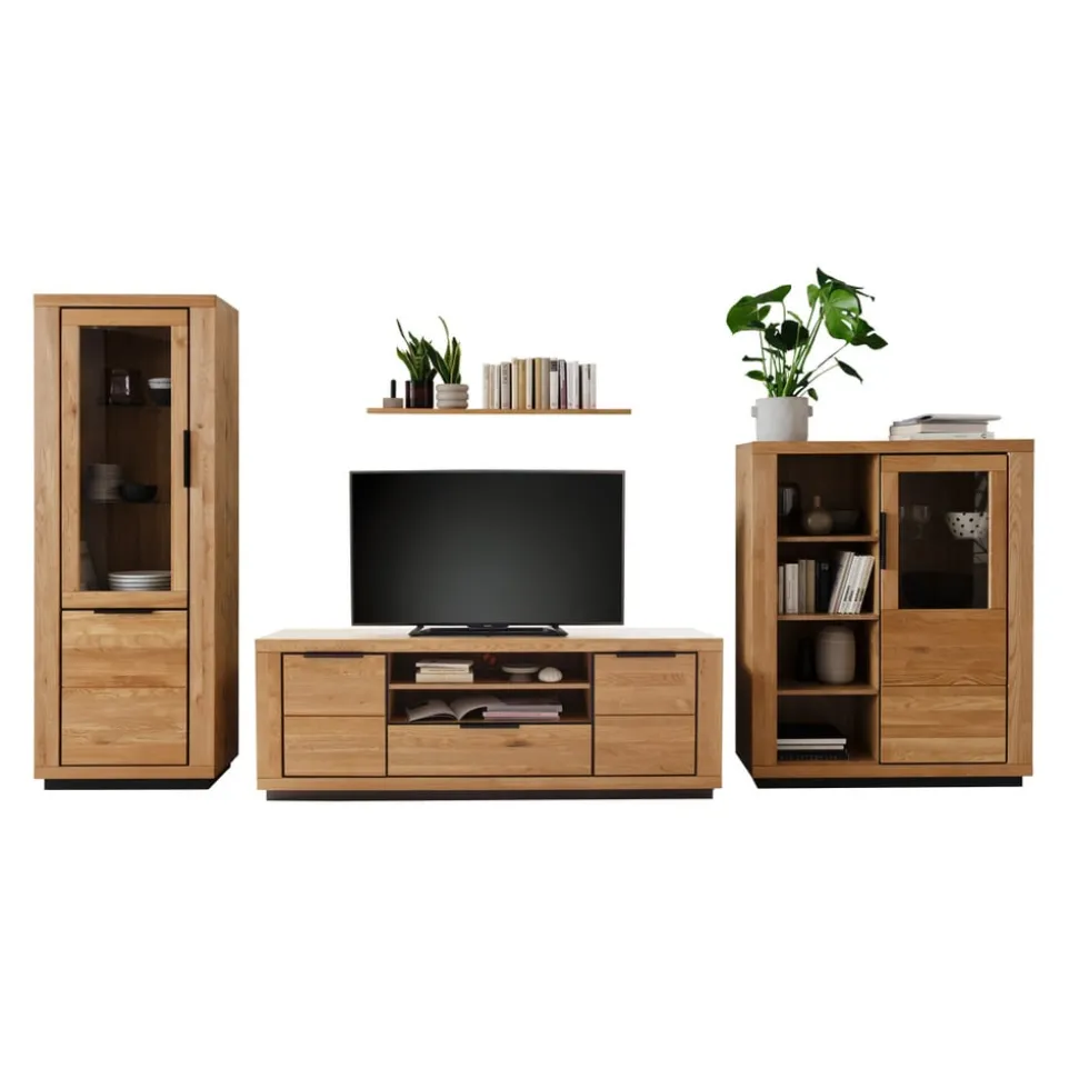 Robustheit trifft auf Eleganz: Die Wohnkombination Greno von MID.YOU beeindruckt mit massivem Wildeichenholz. Diese Kombination vereint zeitlose Schönheit und Qualität, die durch das massive Holz garantiert wird. Das Material strahlt eine natürliche Wärme aus und schafft eine einladende Atmosphäre in deinem Zuhause. Die Wohnkombination bietet eine flexible Möglichkeit, deinen Wohnraum stilvoll und funktional zu gestalten. Obwohl die Beleuchtung exklusive ist, kannst du deine eigene kreative Lösung hinzufügen, um die natürliche Schönheit des Holzes zu betonen. Entdecke mit der Wohnkombination Greno eine neue Dimension der Wohnraumgestaltung.